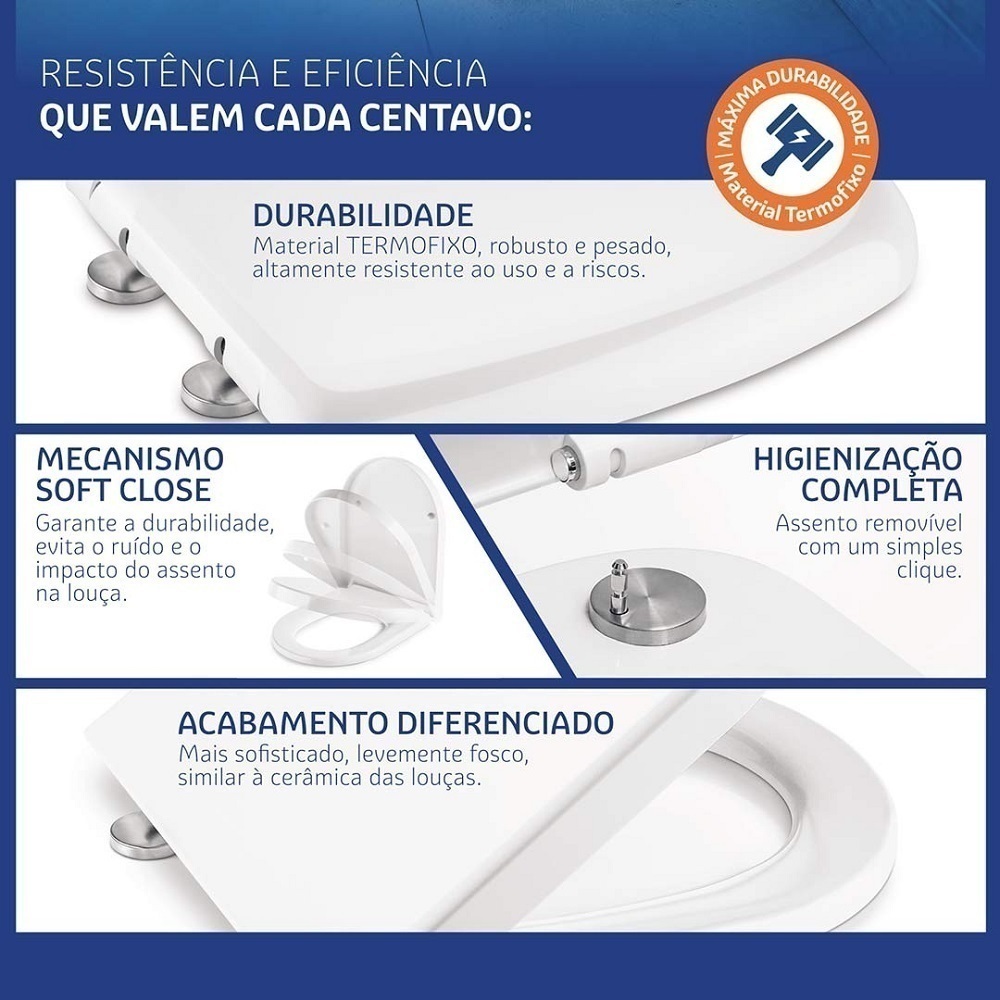 Com o Assento Sanitário Tigre Smart Monte Carlo seu banheiro vai ter o acabamento que merece: aspecto sofisticado e facilidade na limpeza. O exclusivo mecanismo soft close dá um fim pro barulho na queda da tampa e você tem mais segurança, tanto na hora de usar quanto na certeza de ter em casa um produto de alta durabilidade. É soft, é suave, é Tigre.BENEFÍCIOS :*****************Mecanismo soft close: evita o ruído e o impacto do assento sanitário batendo no vaso, além de garantir mais durabilidade para o produto. Total segurança para o usuário pois evita o fechamento indesejado nas mãos.Fácil remoção do assento: os botões que ficam na base do assento sanitário permitem que ele seja removido da louça por completo. Dessa forma, é possível lavar em qualquer tanque, o que garante uma limpeza completa.Resistente: a matéria-prima de altíssima qualidade usada na fabricação do assento sanitário, além do mecanismo soft close, garantem elevada resistência.Acabamento diferenciado: a qualidade da matéria-prima dá um aspecto mais sofisticado ao assento sanitário, deixando ele com acabamento parecido com o das louças sanitárias, e proporcionando uma superfície lisa que facilita a limpeza.Fixação em inox: oferece um aspecto mais sofisticado e estético ao assento sanitário, proporcionando resistência à umidade e resíduos de produtos de limpeza.Garantia de 1 ano: reforça a qualidade do assento sanitário e a confiança na marca Tigre.Aba higiênica no tampo: abre e fecha da tampa do assento sanitário sem necessidade de tocar no vaso, mais higiene e segurança para o consumidor.Pinos na fixação em poliamida: mais estabilidade para o assento sanitário, evitando desgaste da peça e impedindo que ela se mova.Batedores na base e no tampo: mais higiene para o produto, pois evita que o assento sanitário entre em contato com a louça.