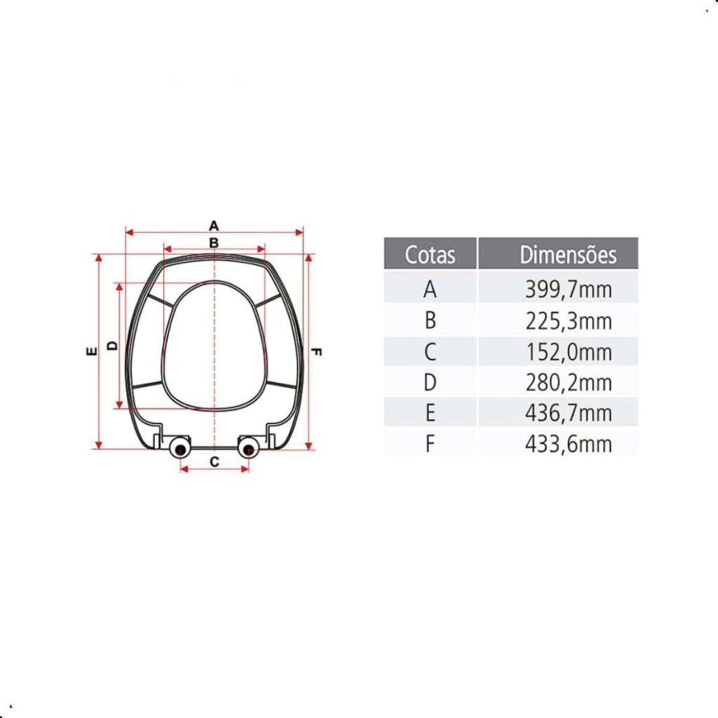 - Medidas: L 39,9 x C 43,6 x Entre furos 15,2cm- Cor: branco- Fechamento: soft close- Material: resina termofixo- Sistema easy clean com botões de acionamento para remoção, facilitando a limpeza completa da louça- Acabamento: levemente fosco- Aba higiênica no tampo: possibilitando abrir e fechar a tampa sanitária sem tocar no vaso- Resistência à risco: sim- Quantidade de calços: 4- Fixadores ajustáveis com parafusos em Inox e Nylon- Indicado para bacia sanitária: Thema- Marca recomendada para uso: Incepa- Fabricante: Tigre- Tampa com cobertura total que abafa o som da descarga- Fixação em inox- Pinos na fixação em poliamida