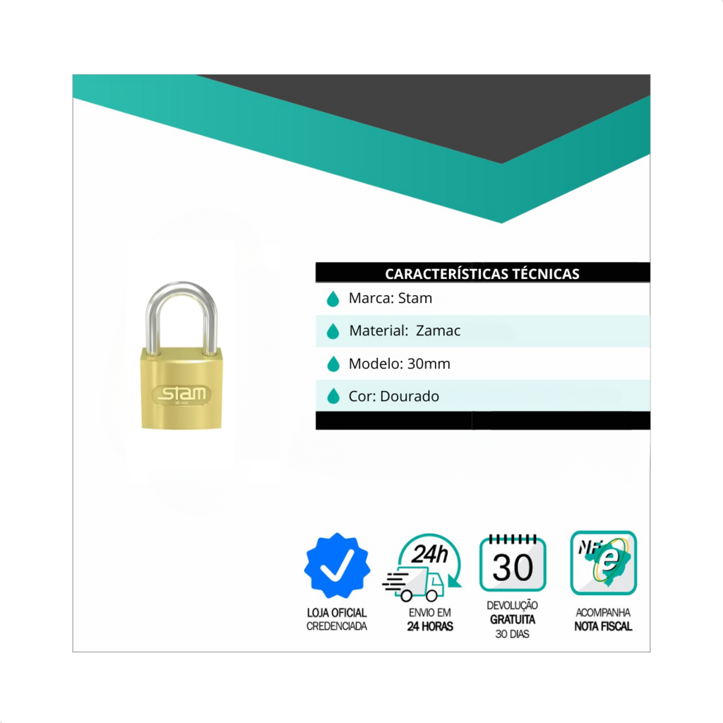 Cadeado Stam Metal 30mm Precisando de um cadeado? Este produto, possui haste com aço temperado e corpo em ZAMAC. Esses cadeados são perfeitos para uso em armários, gavetas, mochilas e pequenos objetos que precisam de proteção. Oferece resistência a impactos e corrosão, oferecendo maior segurança para o que você precisar. Invista em praticidade e conforto com os produtos do Bruno acabamentos!