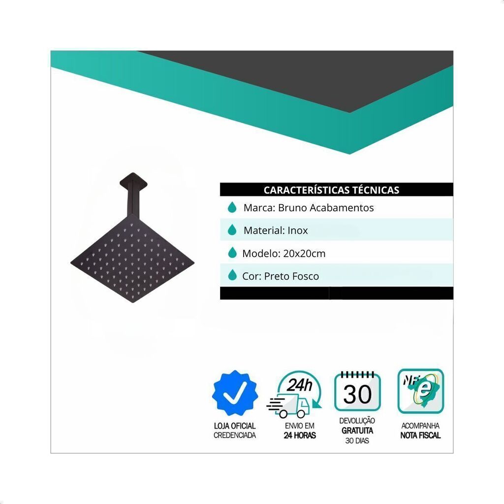 - 01 Ducha Quadrada 20x20 de teto - Preto Fosco
