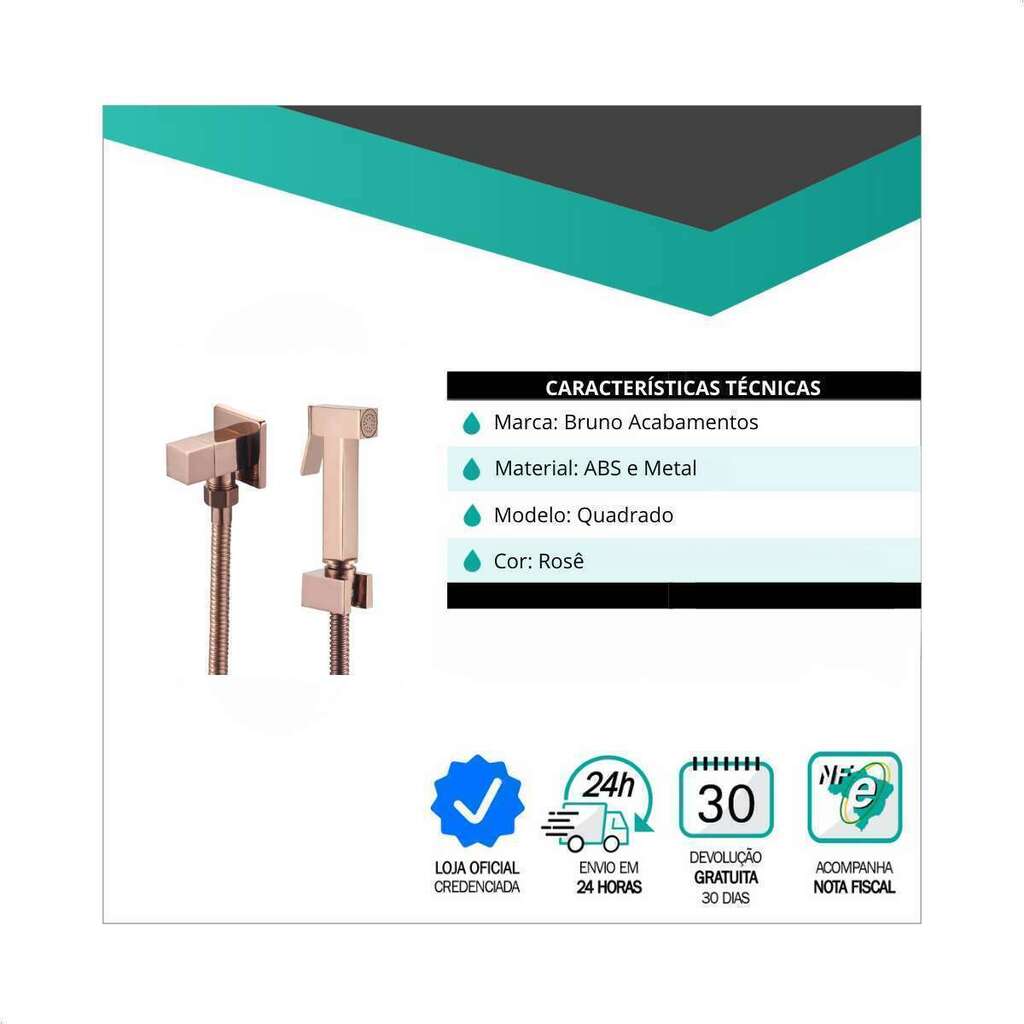 Desenvolvida com um acabamento rose, a ducha higiênica quadrada conta com um gatilho e mangueira 100% em metal, assim como seu acabamento de registro, sendo em ABS unicamente as peças de suporte para parede. A mangueira possui 1,20m de altura e entrada de 1/2, enquanto para os acabamentos de registro é ideal padrão Deca ou similares com 16 estrias. Para um fluxo otimizado de água é necessário uma boa pressão de água, lembre-se de manter o acabamento de registros fechado enquanto não há uso para manter a usabilidade do produto.