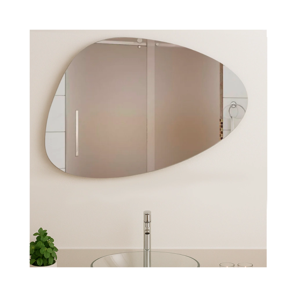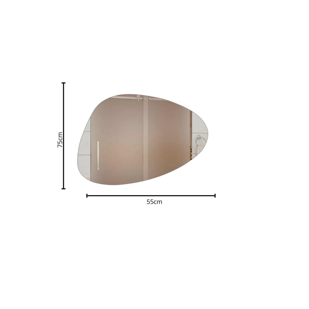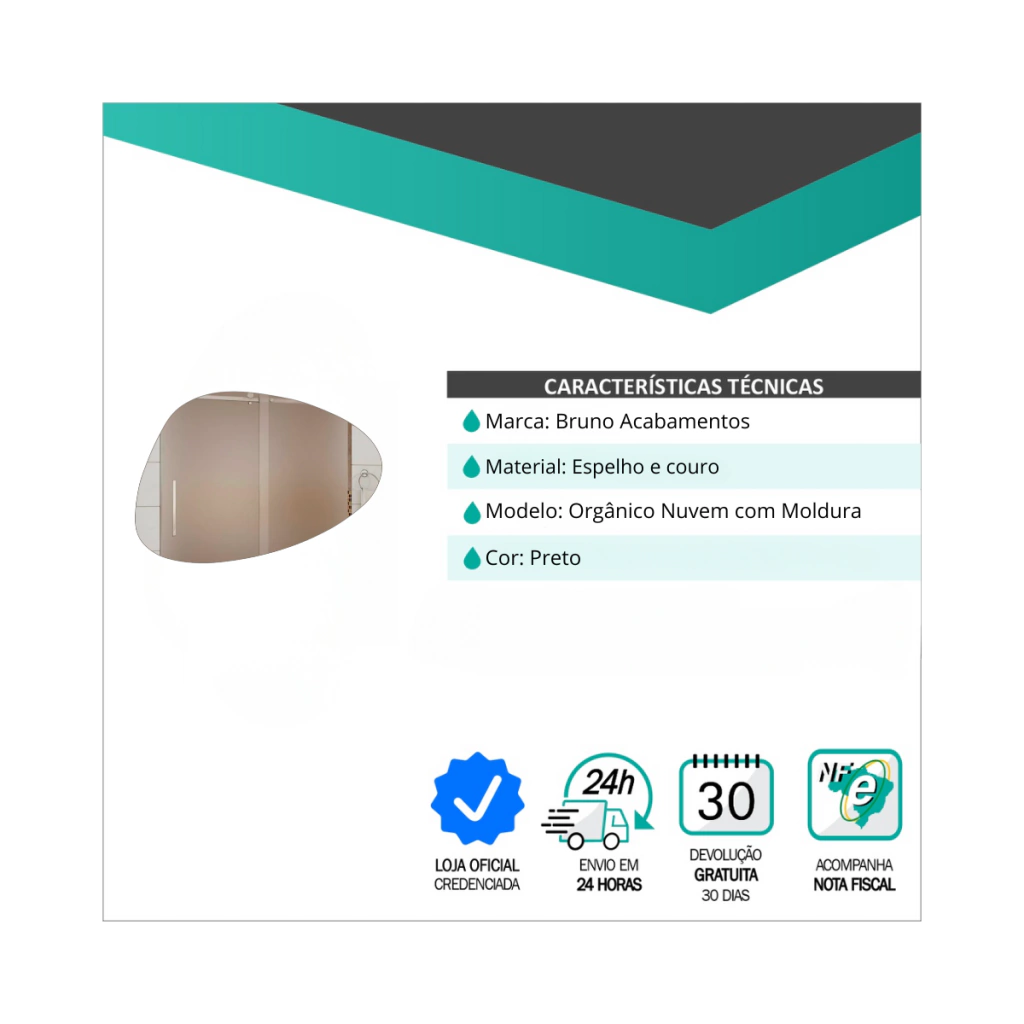 Este produto foi desenvolvido em espelho e moldura em couro preto. Com formato de nuvem, altura de 75 cm e largura de 55cm. Fornece nitidez, qualidade e resistência a ambientes mesmo com umidade.