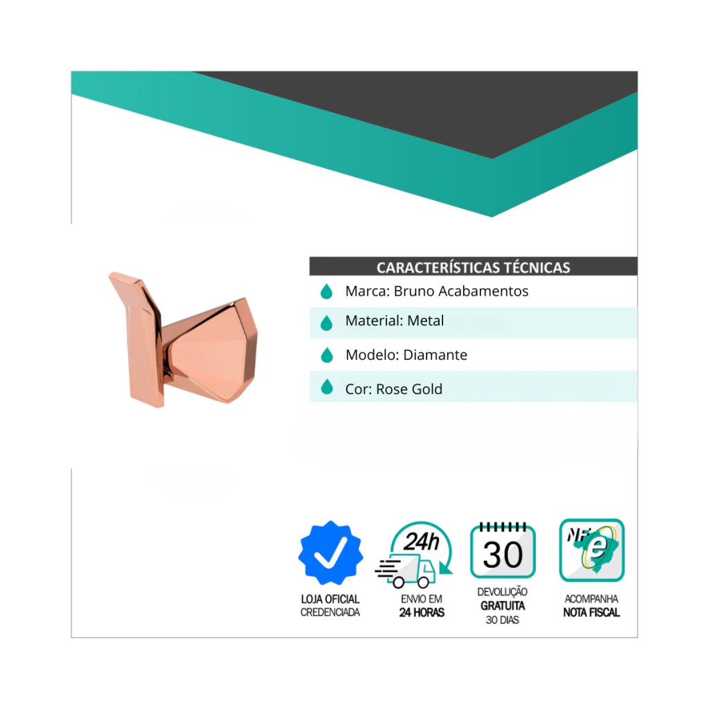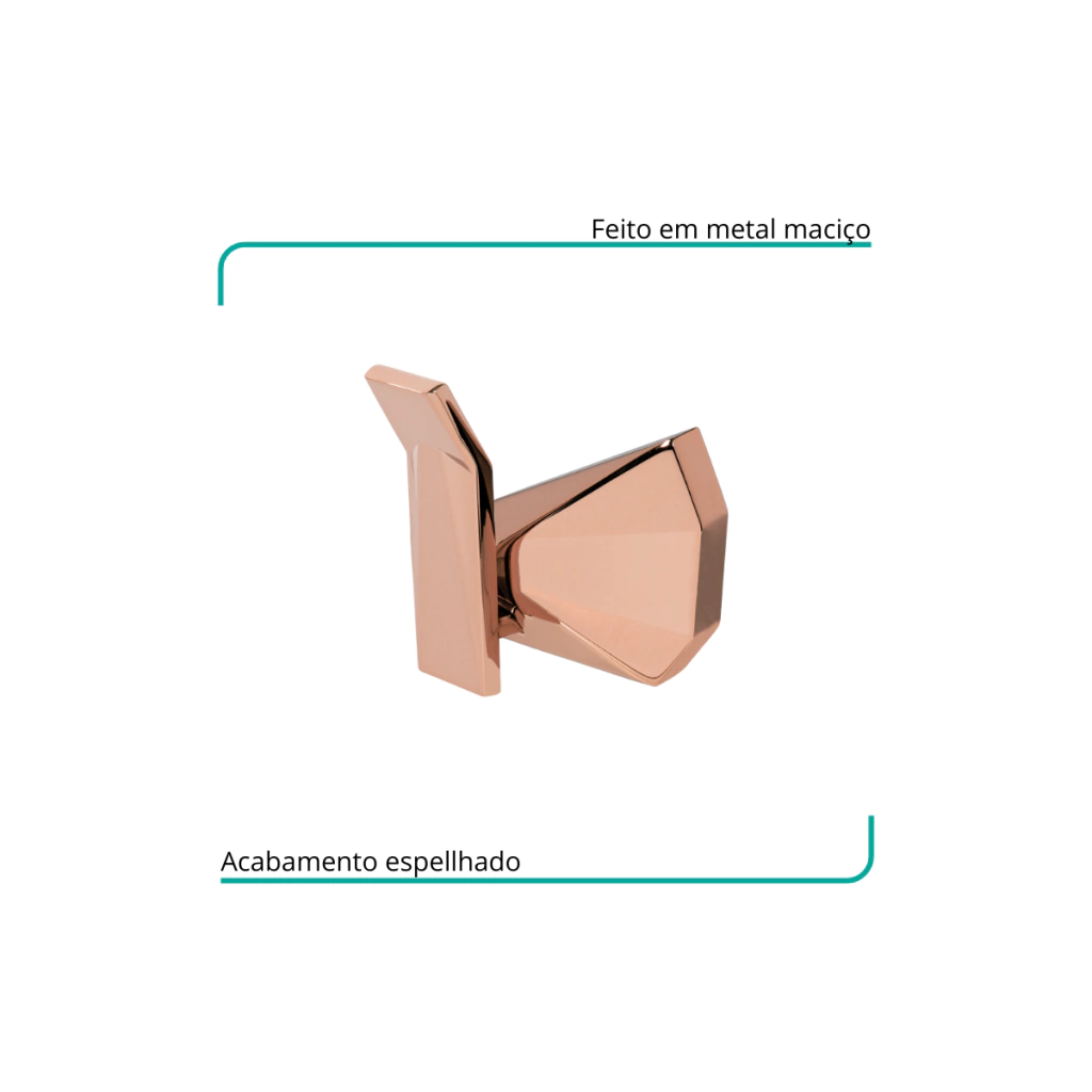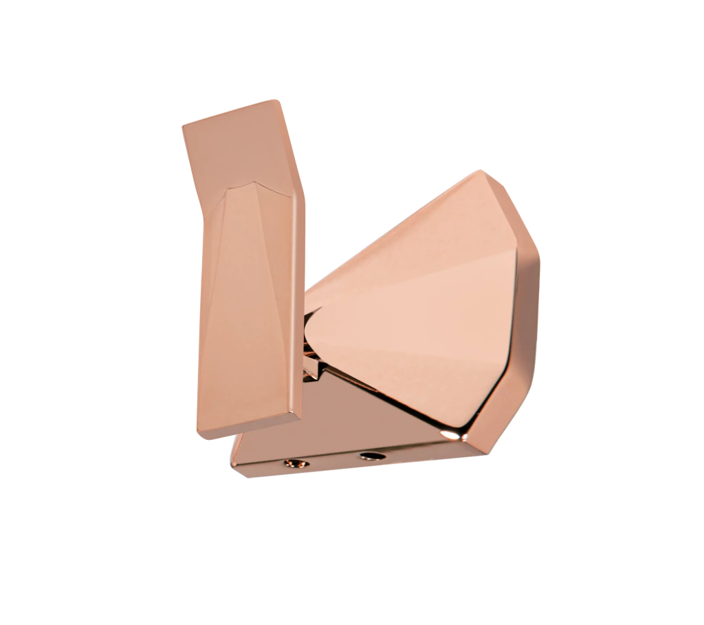 Desenvolvido em 100% em metal, o Cabide Diamante conta com um design único e seguro! Sua instalação é feita por parafusação, permitindo que seja discreto e suporte o peso de roupas e toalhas.  A pintura em Rose Gold fosco foi executada pelo método cataforese, garantindo proteção contra avarias e umidade pois é um produto muito além da estética! É feito para durar.