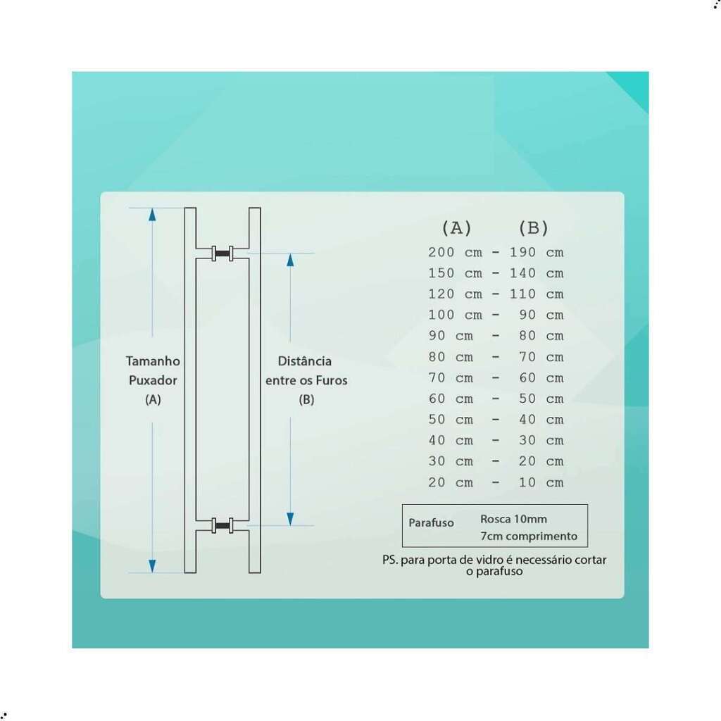 R: A distância entre os furos segue um padrão de 10 cm a menos que o comprimento total do puxador, ou seja, no modelo de 40 cm a distância é de 30 cm.