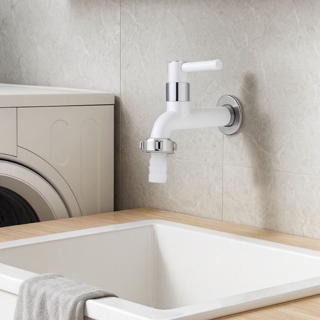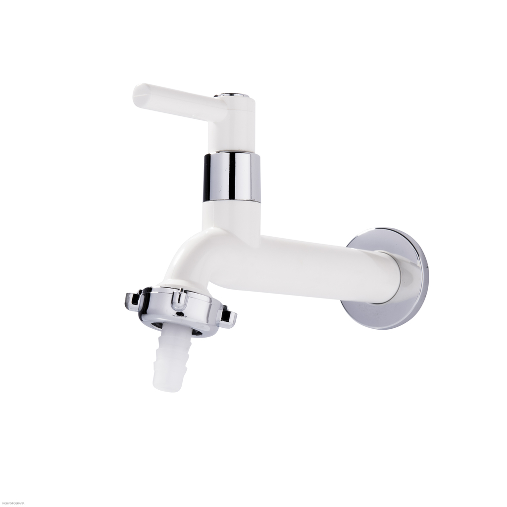 Torneira para cozinha ou tanque fixação - parede longa com bico mecanismo 1/4 de volta cor: branco / cromado fixação: 1/2 material: Abs - ideal para modernizar seu lar